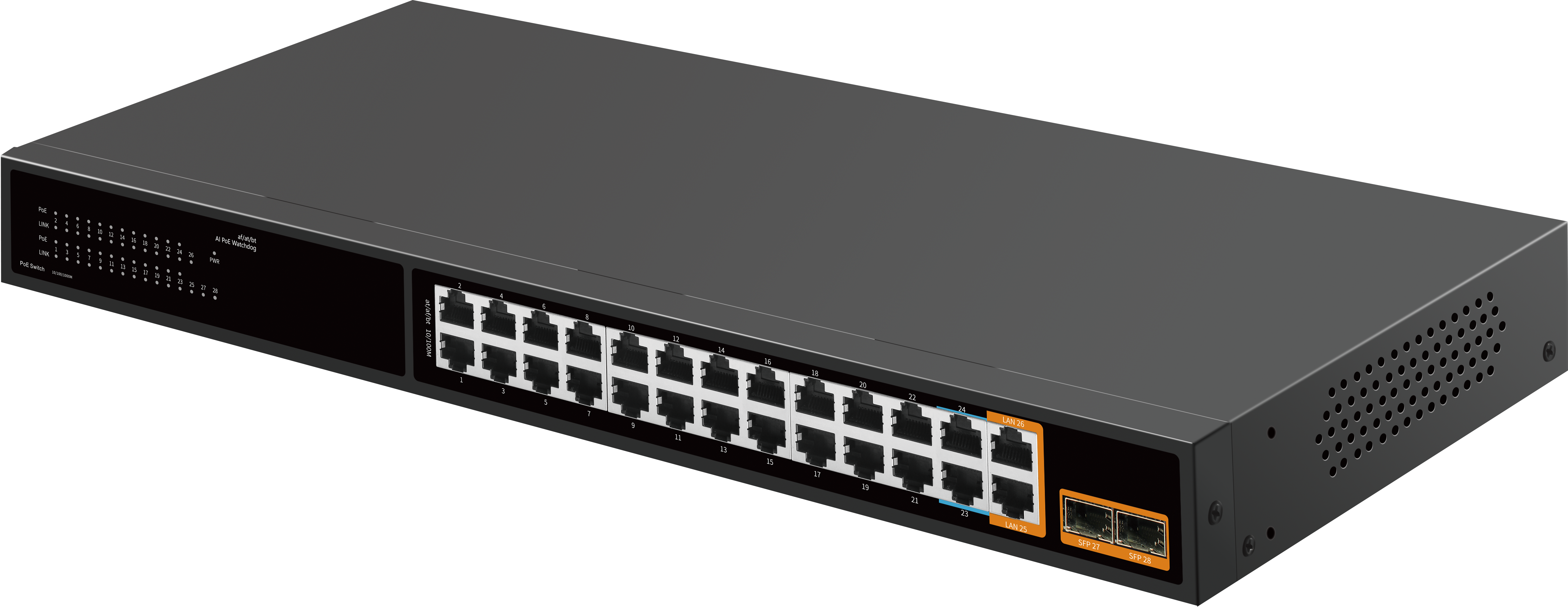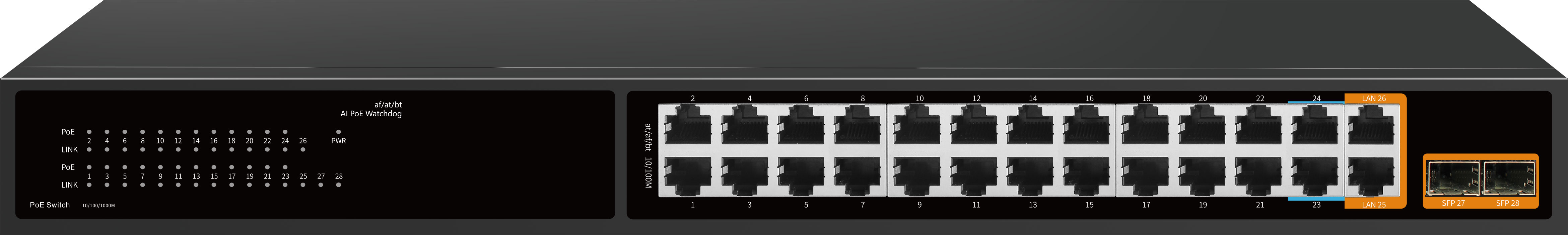 | PoE(1-22):10/100Mbps PoE ports(RJ45)PoE (23-24):10/100Mbps PoE ports,Support bt 60w High PowerLAN(25-26):10/10011000Mbps uplink ports (RJ45)SFP(27-28):10/100/1000Mbps SFP port |
